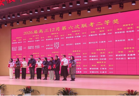 本次研讨会立足于安徽中职高质量发展及职教高考改革持续深化的时代背景,旨在通过交流互鉴,提升职教高考的育人质量与实效。另外,大会还对2026届职教高考第六次全省联考成绩进行了深度剖析,并分专业对表现优秀的学校和学生个人进行了表彰和颁奖。我校工商财贸学部财经专业荣获“达线人数优胜学校”和“达线均分优秀学校”双优荣誉。成绩的取得离不开学校及学部领导的关怀指导,离不开职教高考班老师们的辛勤付出。回首2025,我们披荆斩棘,收获满满;展望2026,我们将乘风破浪,再启新程!学校将继续坚守育人初心,深化教育教学改革,优化人才培养模式,不断提升办学质量和内涵,努力为每一位学子的成才铺就更加广阔的道路,为社会培养更多高素质技术技能型人才。
