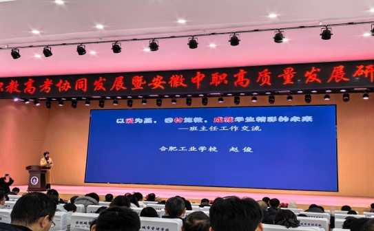 12月27日,由安徽职教高考协同发展联盟和合肥勤径文化传播有限公司共同主办的“安徽职教高考协同发展暨安徽中职高质量发展研讨会”在合肥城市管理学校隆重召开。来自全省100多所职业院校的领导、班主任及骨干教师齐聚一堂,共同探讨新形势下职教高考的改革方向、备考策略与教学模式创新。我校职教高考团队吴玉龙、赵俊、余晶晶等6位老师在教务处刘文处长的带领下参加了此次大会。工商财贸学部优秀班主任赵俊老师应邀出席会议,并作为名班主任代表在大会上作管理经验分享,她以《以爱为基,因材施教,成就学生精彩的未来》为题,进行了深入浅出的阐述,赵老师的分享围绕管理篇、学习篇、家校共育篇三大核心维度展开,结合多年的带班实践,生动讲述了如何通过日常管理、主题班会、榜样故事、温情陪伴、家校共育等活动,筑牢学生思想根基,营造积极向上、拼搏进取的班级氛围。赵老师扎实的实践积淀与深刻的育人理念赢得了现场嘉宾们的广泛共鸣与高度认可。赵老师的精彩分享,不仅是我校班主任队伍建设与育人成果的一次有力展示,也为兄弟院校在应对职教高考、提升班级管理效能方面提供了有益借鉴。