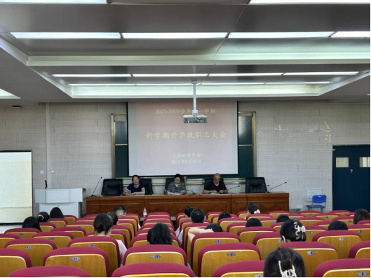 2023年8月25日上午,工商财贸学部在学部会议室召开了新学期全体教职工大会。会议由学部副主任景莎莎主持,全体教职工参加会议。