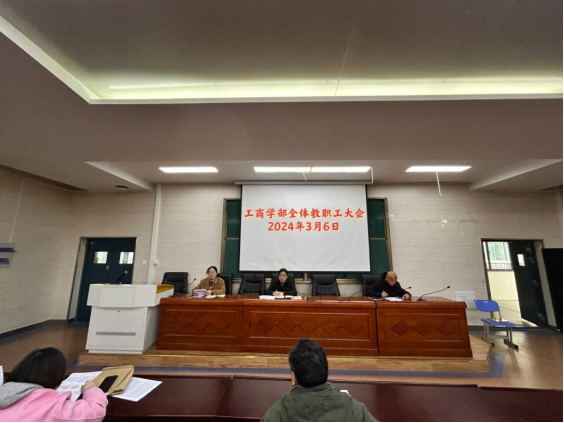 2024年3月6日下午,工商学部期初教职工大会在学部三楼阶梯教室举行。全体教职工积极参与。会上,学部领导就上学期取得的教学成果、新学期教学工作计划及日常管理重点进行了详细通报,并对全体教职员工提出了新的工作要求和期望。