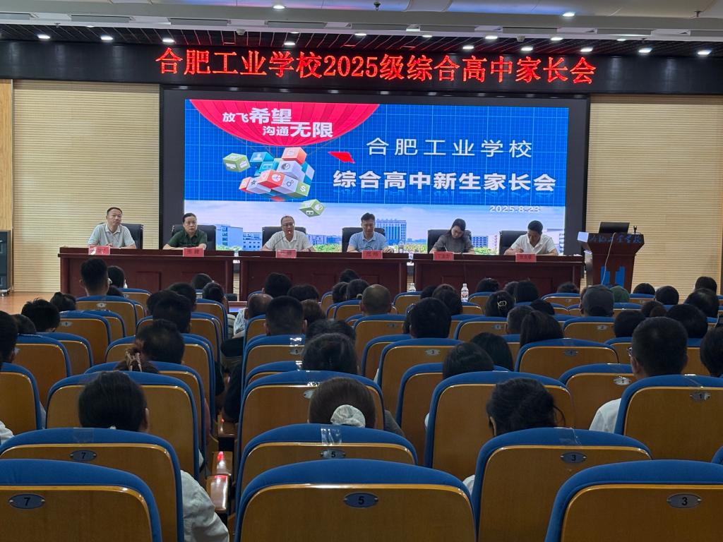 为进一步促进家校沟通,凝聚育人合力,更好地助力学生成长,当天上午报到手续顺利完成后,学校在图书馆四楼报告厅隆重召开了2025级综合高中班家长会。合肥工业学校校长孙健、合肥九中副校长范玮及工商学部相关负责人共同出席本次会议,会议由年级部主任景莎莎主持。景莎莎首先代表学校向全体新生家长表示热烈欢迎,并详细介绍了我校综合高中部的课程设置、教学培养、年级管理等基本情况,强调了家校协同育人的重要性,希望家校共同关注学生的全面成长。九中副校长范玮就综合高中班的课程开设、教育教研、管理模式、师资力量等内容作进一步解读,并从“人生变化、科学规划、心理健康”三方面对学生家长提出相关建议,号召家校共同助力学生迎接全新挑战,希望全体新生能够“扎根工业沃土茁壮成长,沐浴九中春风鹏飞万里。” 孙健校长最后讲话强调,综合高中是一种全新的办学模式,有着强大的政策支持,在与合肥九中联合办学过程中,将会共同建立新的教育教学秩序,探索学生多元化成长路径。