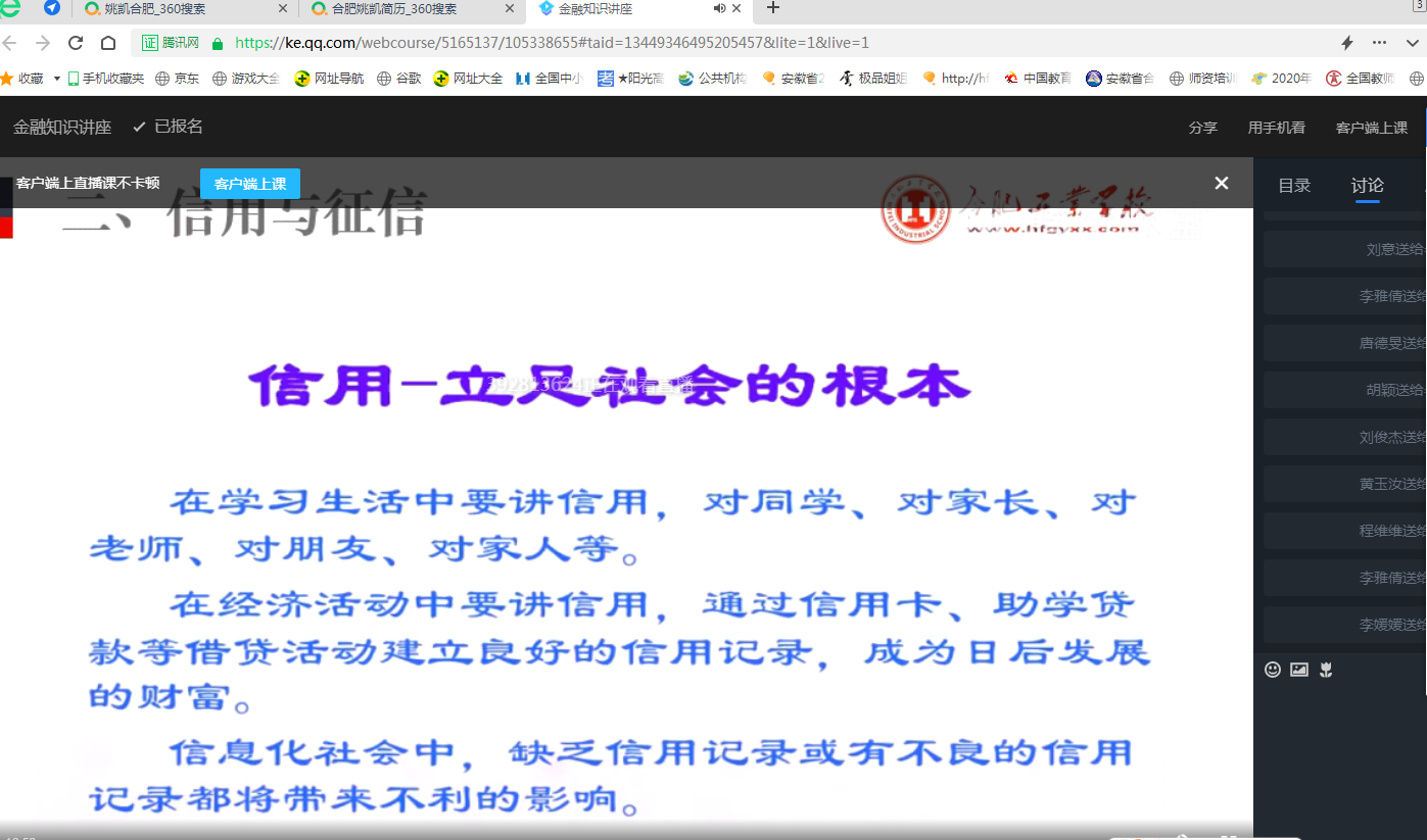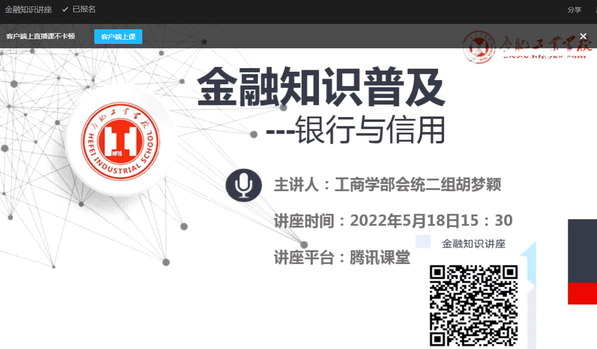 受疫情影响,合肥工业学校学生全体放假,从封校时期的线下教学转变为了线上教学。为了丰富学生线上教学的内容,按照学校资助工作的要求,工商学部会统二组结合资助工作主题举办了一场线上金融知识讲座。5月18日下午15点30在腾讯课堂,会统二组教师胡梦颖进行了主题为《金融知识---银行与信用》的讲座,工商学部全体师生都积极参与。