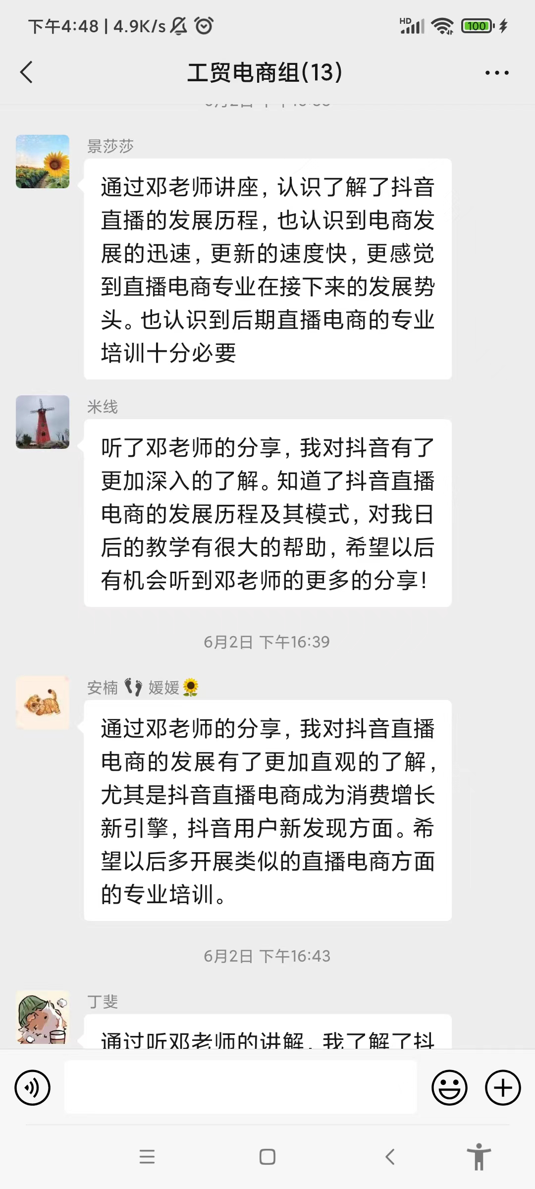 6月2日下午,邓老师开展了一场名为“浅谈抖音直播电商发展”的讲座,讲座围绕流量和用户选择及直播电商未来发展等方面,向电商专业的师生普及介绍了直播电商的未来潜力。讲座结束后,电商组的老师们又针对讲座进行了研讨。老师们纷纷表示,通过邓老师的讲解,大家对电商直播加深了认知,对抖音发展也近一步熟悉。