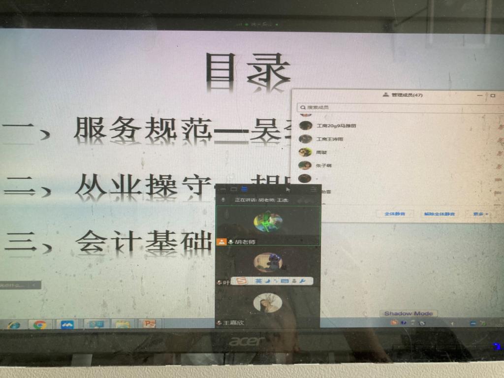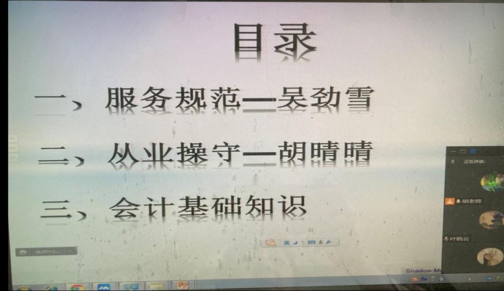 一、服务规范由吴劲雪老师讲解。会计服务规范主要内容有基本原则、职业道德、服务要求。通过服务规范的讲解让学生进一步了解会计专业,以及在以后从事会计工作中需要遵守的服务规范,更好的胜任会计工作。