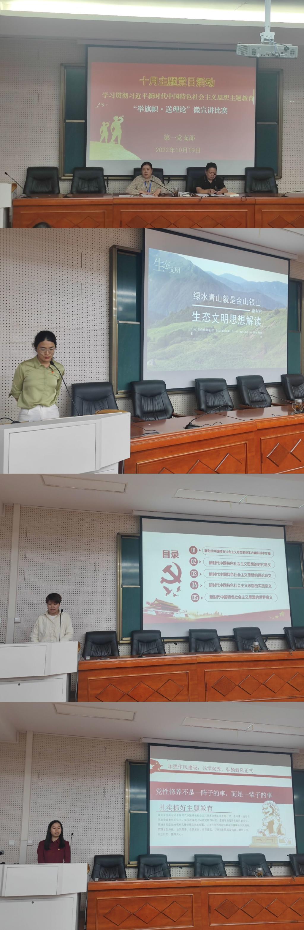 第二阶段十月主题党日活动,支部开展“举旗帜 送理论”微宣讲活动。由第一党支部各党小组的党员代表进行宣讲,各党小组分别召开会议,讨论交流学习成果,对宣讲活动进行评议,最终推选陈文馨同志代表第一党支部参加学校微宣讲比赛。