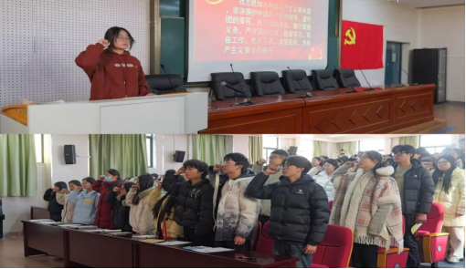 仪式第一项,全体起立,奏唱国歌。随后,宣布新团员名单,颁发礼,宣誓礼依次进行。“我志愿加入中国共产主义青年团,坚决拥护中国共产党的领导……”铿锵有力的誓言回荡在阶梯教室中,彰显着团员们坚定的理想信念与青春热忱。