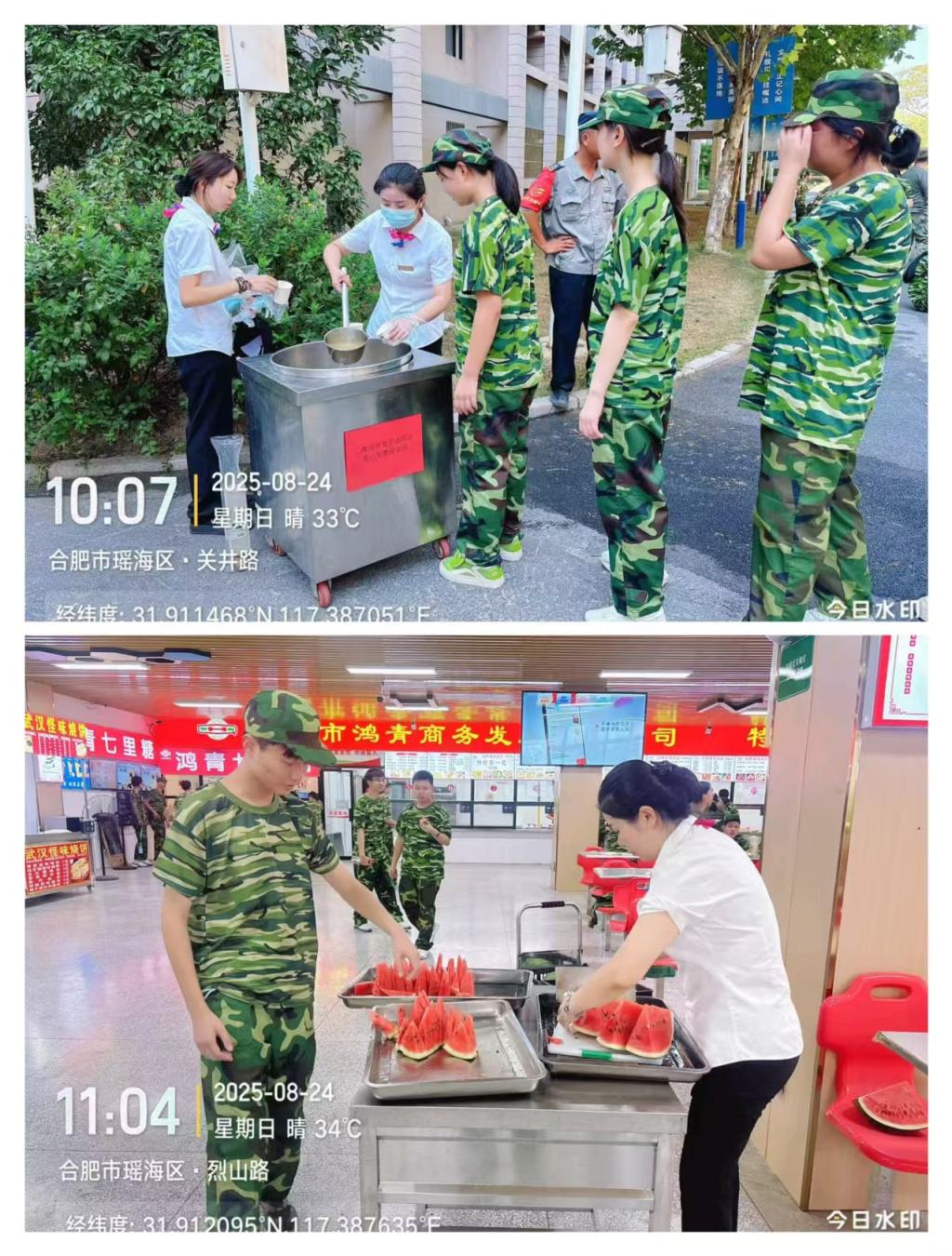 随着军训启动,总务处同步推进“清凉关怀”与“饮食服务”:每日高温时段(上午10时、下午15时),安排食堂工作人员将熬制好的绿豆汤、淡盐水分装成杯,送到军训场地;食堂服务同步升级:一方面推出“开学季免费送西瓜” 活动,每日午餐、晚餐时段,将新鲜切块的西瓜免费发放给师生,累计送出西瓜 1000 余斤;另一方面全面启动新学期供餐服务,针对新生及军训师生优化餐食结构,确保每餐提供3种以上主食、10-20道菜品,兼顾营养均衡与口味需求,同时严格执行食材当日采购、当日消耗,全程留存采购凭证与留样记录。