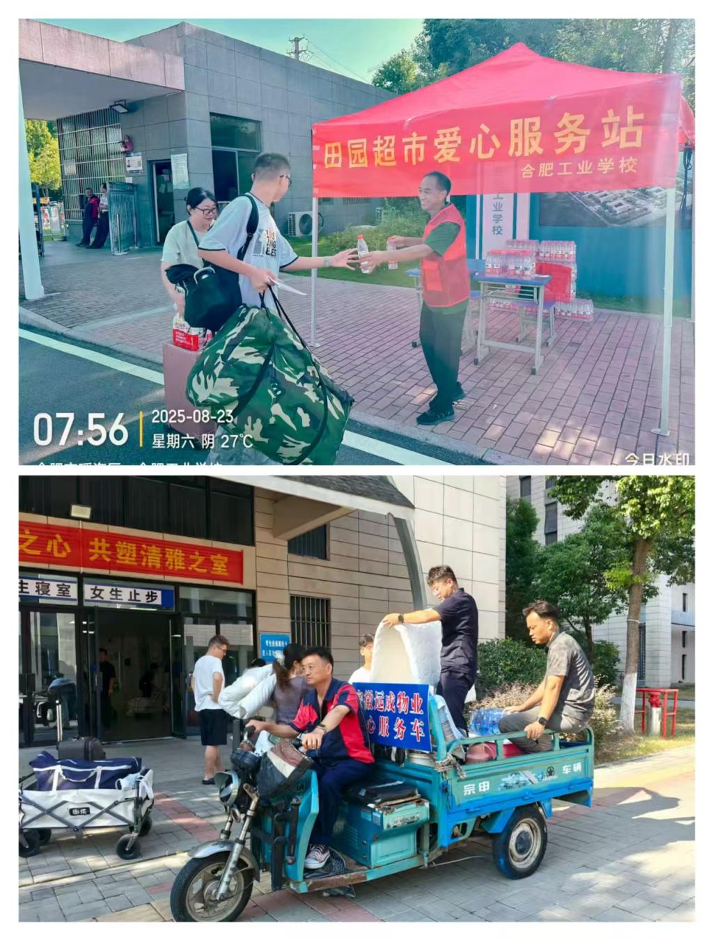 考虑到新生报到时携带行李多、家长陪同奔波易中暑等情况,总务处在校园入口设立“爱心服务站”,配备饮用水、应急药品(创可贴、藿香正气水)等物资,为新生及陪同家长免费提供矿泉水。服务站安排后勤人员与志愿者驻守,不仅提供校园指引、行李临时存放、问题咨询服务,还针对大件行李搬运难题,组织专人提供“点对点行李托运”服务,从校门口直达宿舍楼下,累计帮助500余名学生轻松入校,为家长减轻陪同负担,有效缓解报到压力。