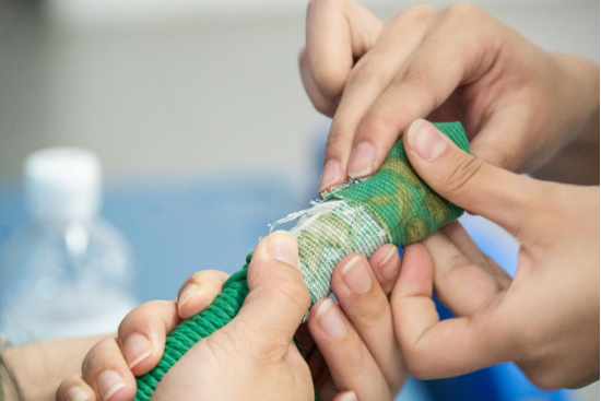 9月8日,各学部大厅及科技楼入口处的“艾草锤制作体验点”已布置就绪。每张桌子上整齐摆放着定制材料包,志愿者们先为到场教师详细讲解艾草锤的文化内涵:“艾草是中医里的‘养生瑰宝’,决明子能清肝明目,这个锤子不仅能敲打经络缓解疲劳,更藏着我们想让老师‘轻松工作、健康生活’的心意。”随后,志愿者们手把手指导制作:从填充艾草包,到用棉线仔细缝合布套边缘,再到穿绳固定手柄,每个步骤都耐心示范。不少教师完成制作后,当场拿起艾草锤轻轻敲打肩颈,“艾草的清香扑面而来,敲着很舒服,这是我收到过最贴心的教师节礼物!”