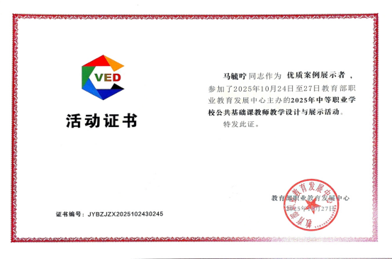 10月24—27日,由教育部职业教育发展中心主办、高等教育出版社等单位承办的2025 年中等职业学校公共基础课教师教学设计与展示活动在山东青岛圆满落幕。合肥工业学校马毓咛老师凭借扎实的教学功底、创新的设计理念与精彩的现场展示,从全国众多参赛教师中脱颖而出,荣获“优质案例展示者” 称号。