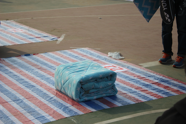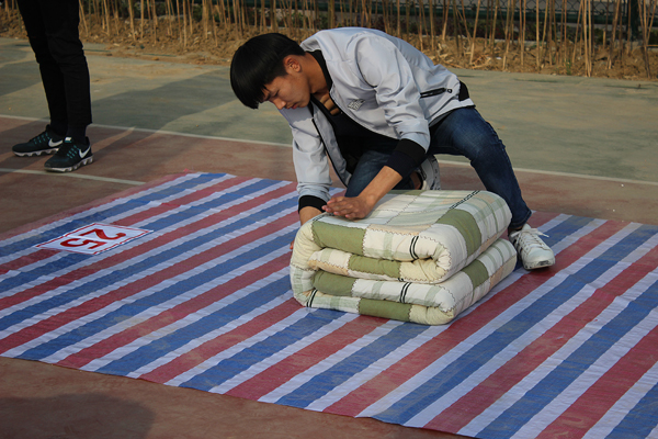 本次比赛以寝室为单位,各寝室推选1名同学参加比赛,参赛选手自备被褥。比赛共分为18组,每轮比赛有50名同学同时参赛,选手必须在2分钟之内把棉被叠成无皱褶、外形美观的“豆腐块”形状。随着比赛口令的发出,选手动作迅速准确,有条不紊。他们以流畅的动作,娴熟的技巧,快速地将平铺的被子折叠,压实,提棱角…… 选手们在沉着应战,现场观众情绪高涨。很快,一床床平铺的被子经过参赛同学的整理,变成了一个个四四方方的“豆腐块”,整整齐齐地摆放在比赛场地。经过选手激烈角逐,评委打分,最终评出各名次奖项,比赛活动取得圆满成功。