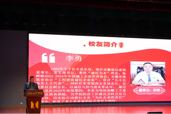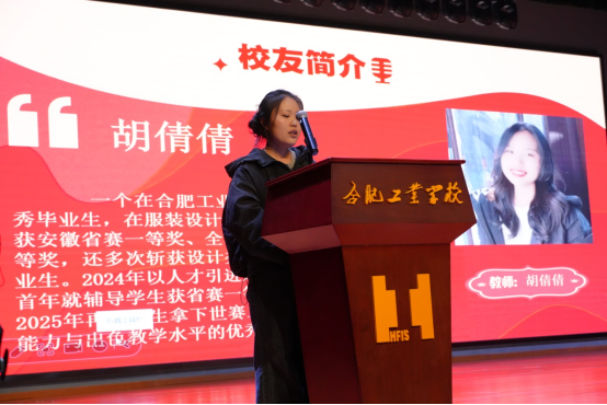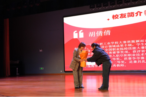分享会上,两位优秀校友——安徽恩达建筑科技有限公司董事长李勇、阜阳职业技术学校优秀教师胡倩倩,分别讲述了自己从合肥工业学校毕业后的奋斗故事。李勇校友以“诚信为本”的创业理念和回馈社会的担当精神,展现了企业家的责任与情怀;胡倩倩校友则分享了从技能大赛获奖者到金牌教练的成长路径,生动诠释了职教学子凭借精湛技能实现人生价值的多元可能。他们鲜活的经历极大鼓舞了在场学子,引发强烈共鸣。