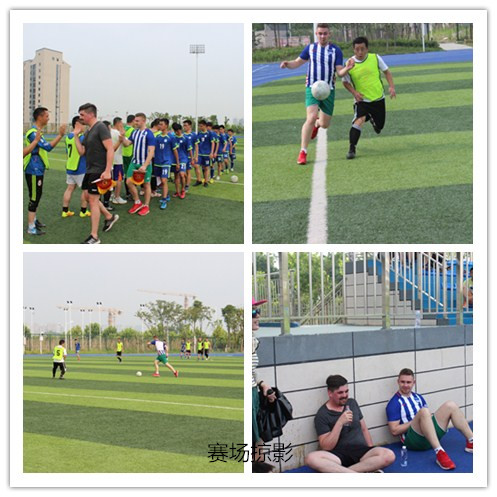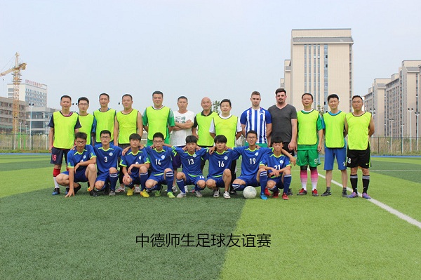 时值下午,今天交流活动的压轴大戏在学校田径场上演,校学生足球队与教工足球队举行足球友谊赛,2名德国学生作为外援加盟学生队。赛场上,双方顽强拼搏、你追我抢,比分交替上升,闷热的天气丝毫没有削弱双方的热情,平均年龄达40岁的教工队坚持跑完全场90分钟,Tim和Shawn展示出德国足球特有的技战术素养和团队精神,Tim上演“大四喜”、Shawn独中三元。随着裁判一声终场哨,比分定格9:8,教工队险胜。比赛结束,双方意犹未尽、亲切合影,场外观众加油助威、气氛热烈,将当天的交流活动推向高潮。