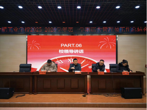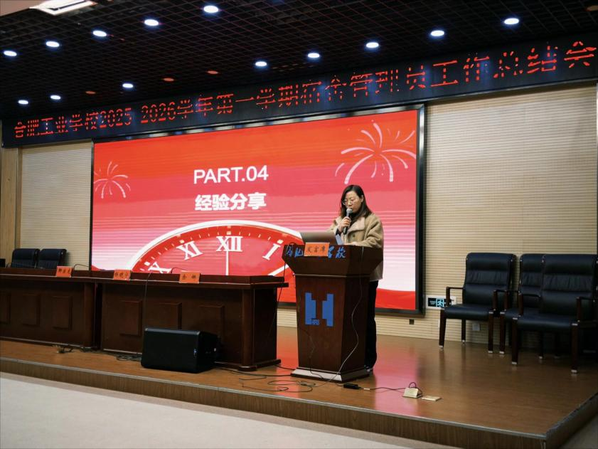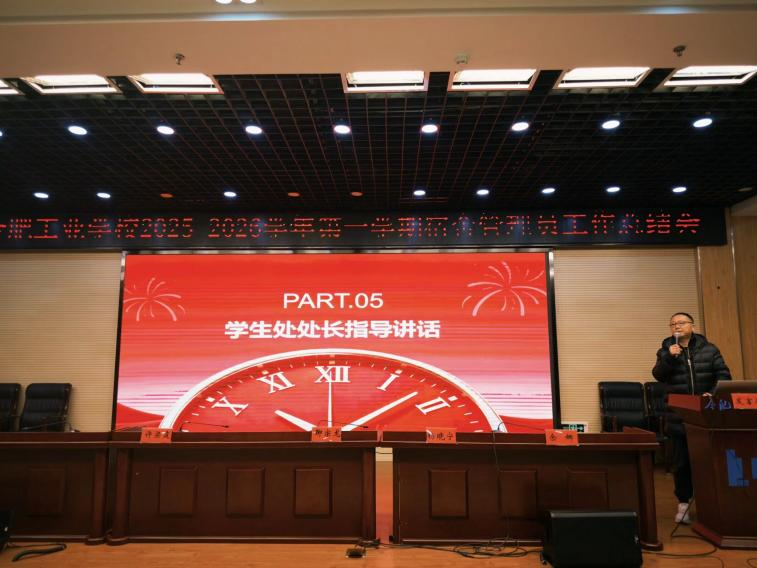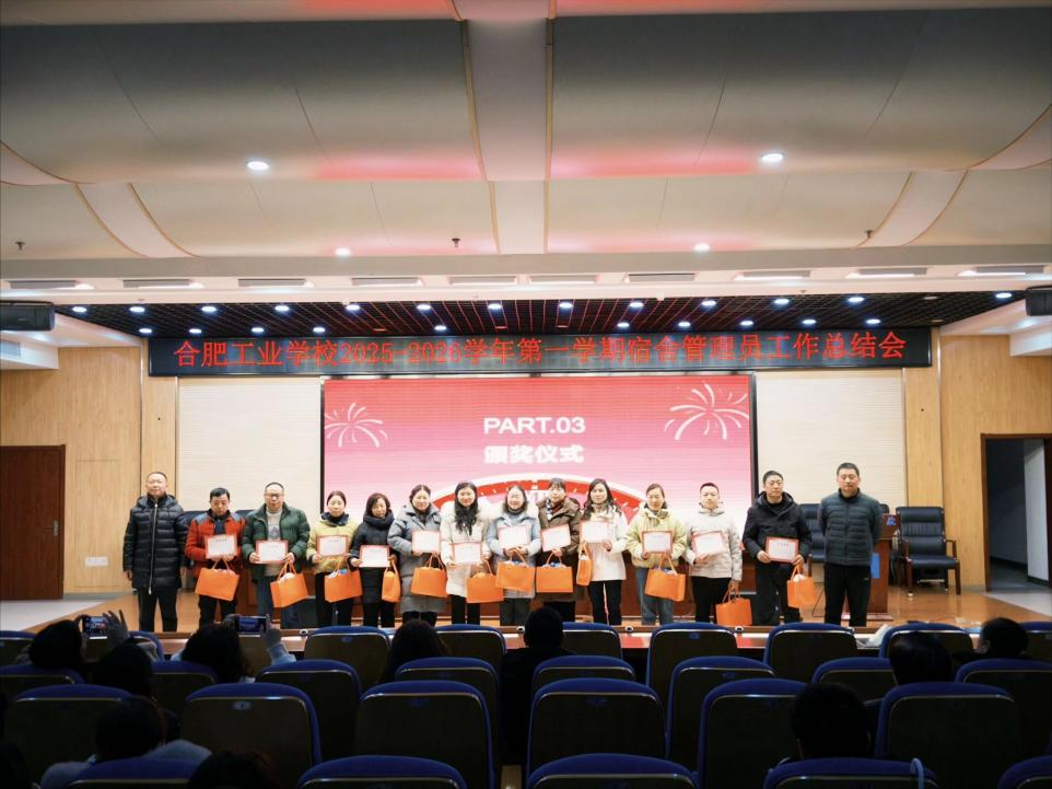 为加强宿舍管理队伍建设,总结本学期宿舍管理工作成效与经验,明确后续工作方向,提升宿舍管理服务水平,2026年1月26日,合肥工业学校在图书馆四楼报告厅召开2025-2026学年第一学期宿舍管理员工作总结会。全体宿舍管理员参加会议,校党委委员、副校长聊宗龙、学生处处长杨晓宁出席会议。会议由学生处副处长余娜主持。