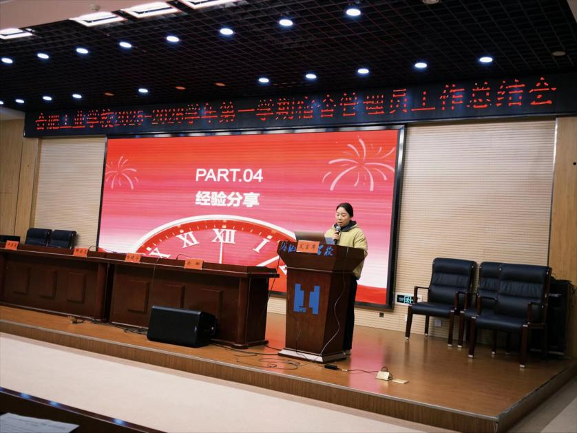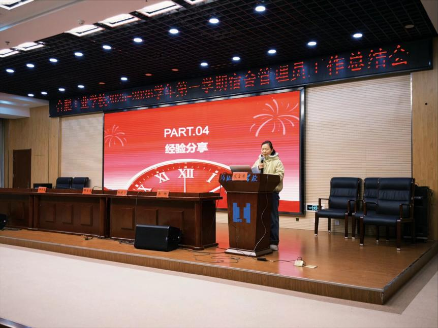 女生宿舍代表韩苗玲、男生宿舍代表胡书玲及宿舍主管楚迎春依次上台,分享了各自在日常管理、应急处置、学生沟通等方面的宝贵经验,为全体宿舍管理员提供了务实有效的借鉴范例。