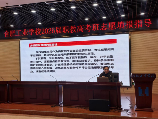 为帮助2026届职教高考班学子精准把握志愿填报政策、科学规划升学路径,3月12日下午,合肥工业学校教务处组织开展2026届职教高考志愿填报专项指导活动。主讲人是年级组长吴玉龙老师,他深耕职教高考教学与升学指导工作多年,对安徽省职教高考招生政策、院校招录情况及填报技巧有着精准且深入的研究,实操经验丰富。400余名学生到场聆听,为自己的升学之路保驾护航。