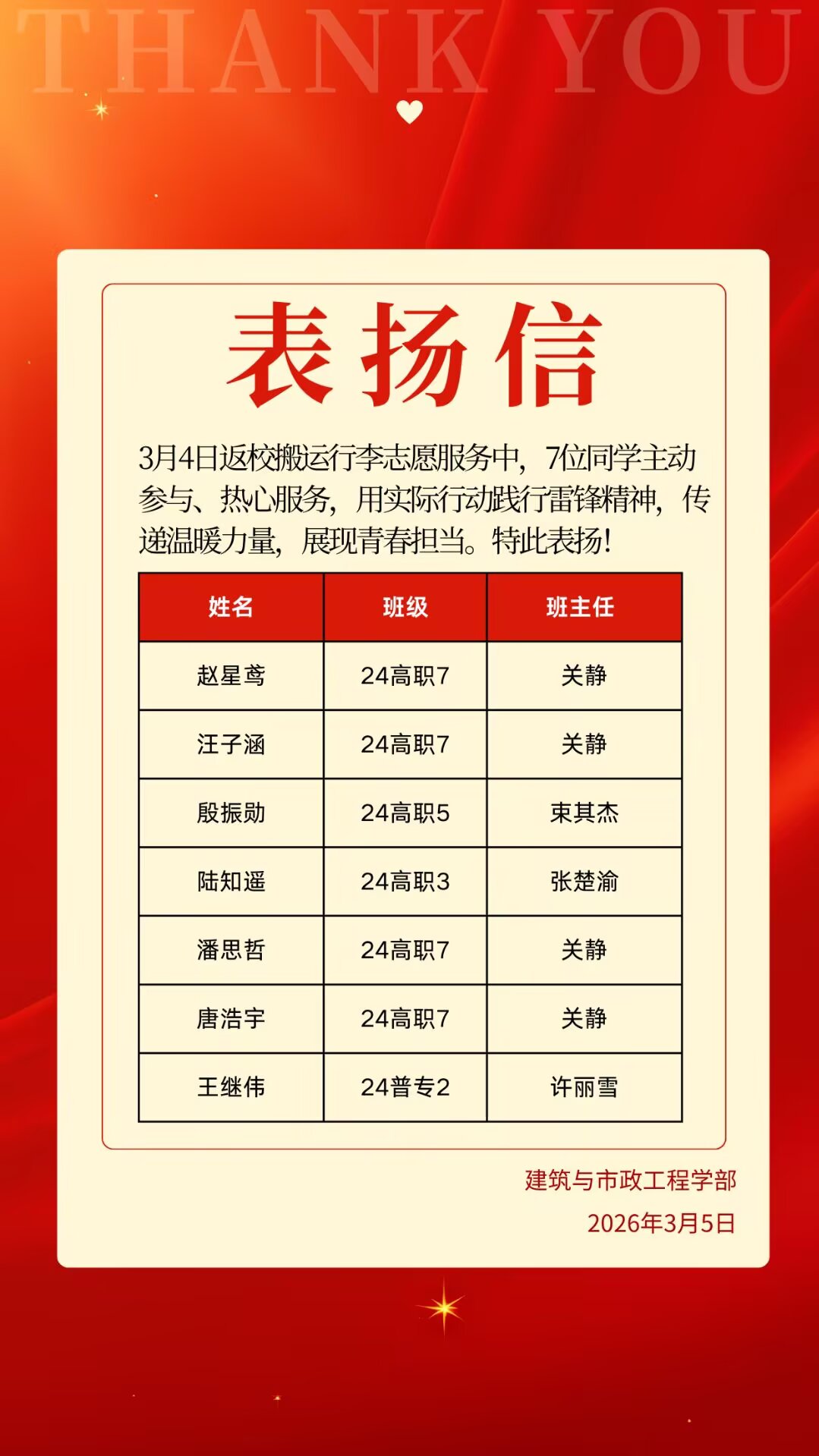 此次主题团日活动,将思想学习、价值引领与实践行动有机融合,让正确政绩观学习教育向青年群体延伸,让雷锋精神在校园落地生根。下一步,建工学部团总支将持续开展形式多样的志愿服务活动,推动学雷锋活动常态化,引领广大团员青年端正人生追求、厚植家国情怀,以青春之力践行初心使命,让雷锋精神代代相传。