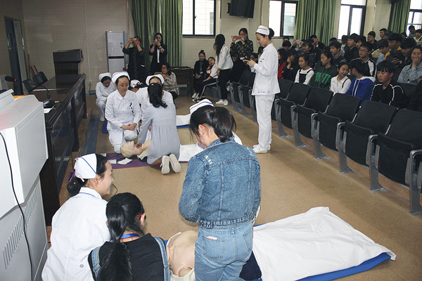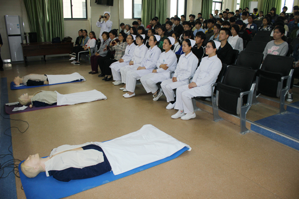 4月20日下午,安徽省护理协会的专家一行8人,亲临学校开展培训。首先窦医生就平时生活中可能会遇到的各种紧急情况,比如心肺复苏术、出血的各种止血措施、外伤的包扎技术、异物刺伤时的正确处理、骨折情况下的肢体固定、包扎和搬运病人时的注意事项等,进行讲解和演示。随后,专家们现场指导同学们演练了心肺复苏技术。