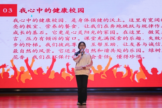 决赛现场气氛热烈、高潮迭起,全方位考验选手的语言表达能力与健康知识储备,让健康理念在舞台比拼中自然传递。自我介绍环节,选手们风格各异、自信昂扬,尽显新时代中职学子的青春风貌与综合素养;稿件播报环节,选手们围绕“健康成长”“青春与健康”“我心中的健康校园”三大主题展开演绎,将对健康校园的理解融入每一句表达;知识问答互动环节,选手们从容应答,既展现出自身扎实的健康素养,也让台下观赛师生同步学习健康知识,让健康理念入脑入心。