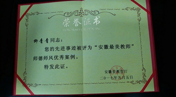 2017年9月7日上午,安徽省教育厅召开“安徽最美教师”表彰暨师德报告会,来自合肥工业学校的柳青青老师荣获“安徽最美教师”师德师风优秀案例受到表彰。
