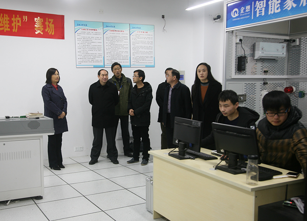 合肥工业学校党委书记、校长王靖全程陪同并系统介绍了学校的基础建设、校园绿化、管理模式、专业建设、招生就业、学生活动以及中职学校质量提升工程等情况,邓传淮对学校整洁优美的校园、科学的办学理念、先进的设施设备给予了高度评价,对学校组建一年多来取得的成就表示满意。在现场调研中,邓传淮一行参观了智能家居安装与维护、激光雕刻、物联网等专业实训室,对激光喷绘技术和物联网技术产生了浓厚兴趣,对学校适应社会经济发展需要、精准定位市场发展方向、积极拓展专业设置予以肯定,对学校坚持理实一体教学模式、培育精益求精的工匠精神充分认可。