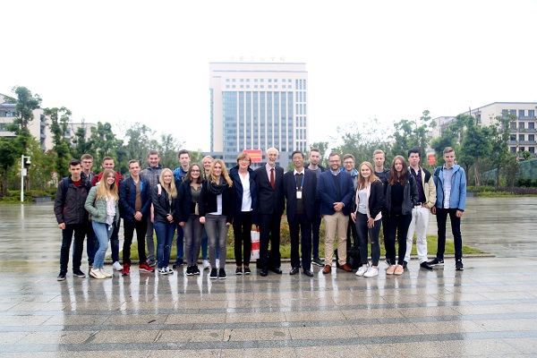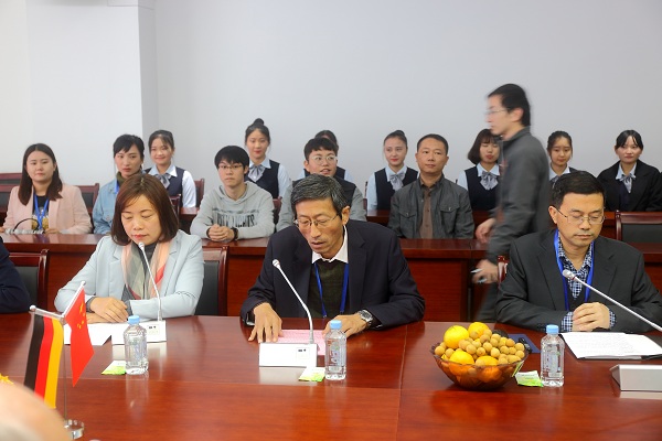 10月16日上午,德国BBS1第一职业学校副校长Peter携夫人Claudia带领师生交流团一行24人抵达合肥工业学校,受到校长王靖等领导班子成员的热烈欢迎。在校礼仪队的引导下,交流团步入欢迎仪式现场,双方分宾主落座。王靖代表合肥工业学校致欢迎辞,他回顾了双方近年交流互访取得的丰硕成果,表达了进一步深度合作的美好愿望。副校长曹文华从学校现状、办学目标、办学条件、专业设置、校园文化、学生能力、对外交流等方面介绍学校发展概况。Peter先生致答谢辞,他十分珍视两校多年建立的的深厚情谊,被新校区宽广而美丽的校园所震撼,热情邀请中方师生回访,表达了积极探索两校深入合作的新模式。为表达感谢,德方学生代表现场表演中国古诗朗诵,更加深了中德文化融合。