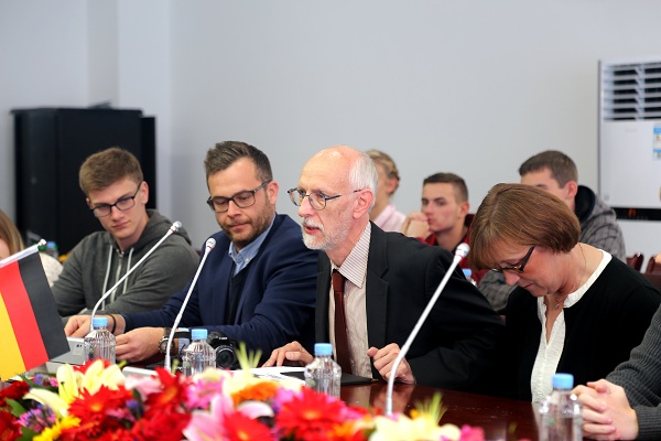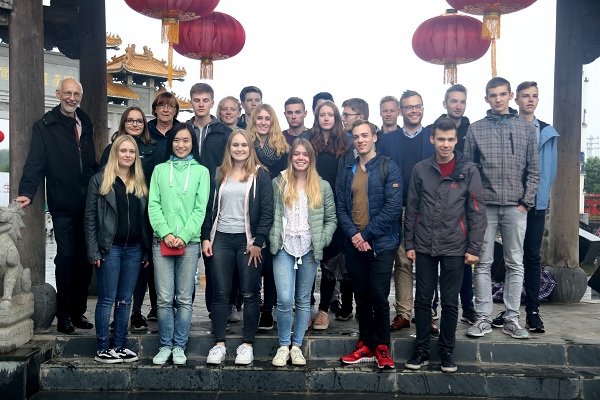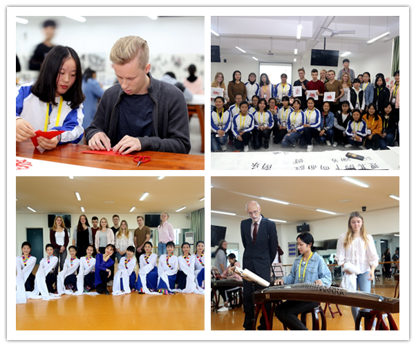 在副校长孙健的邀请下,交流团前往服饰与文化艺术学部参与师生互动交流活动,他们纷纷拿起剪刀、毛笔,在中方学生手把手的示范指导下,亲身体验、全心投入,一幅幅作品映入眼帘,“师徒”双方都迫不及待用影像记录下这美好瞬间。民族舞蹈、古筝演奏、红歌合唱等极富中国特色的艺术表演深深打动了德方师生,他们抑制不住激动的心情,主动上台为大家演奏钢琴乐曲,将活动推向高潮,时至正午,双方仍依依不舍、意犹未尽。下午,交流团前往中国非遗园参观考察,领略中华民族传统文化魅力,品味中国非物质文化遗产。