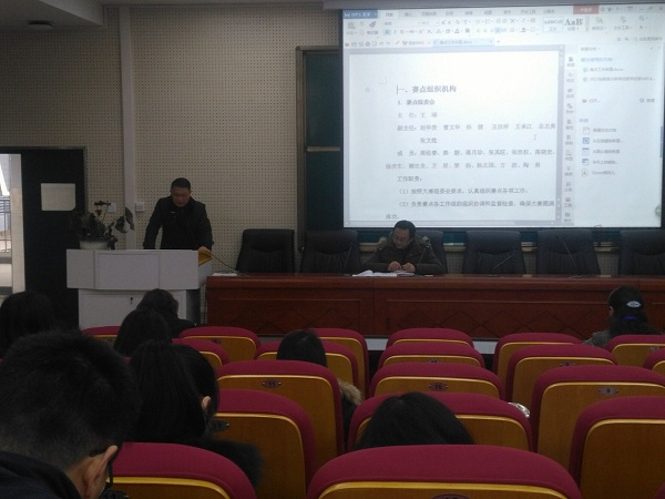 实训处周经春处长就赛点组织机构、大赛日程、赛事安排、任务分工、大赛安全、注意事项、外出参赛、暴雪极端天气应急预案等情况做详细布置。
