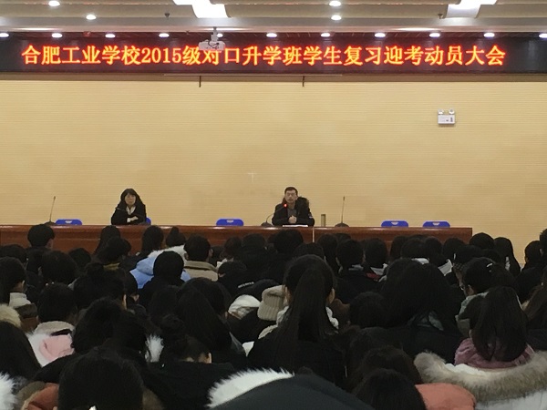 1月25日,合肥工业学校召开2015级对口升学班学生复习迎考动员大会,300余名师生参加,副校长曹文华到会并讲话,教务处处长蒋月珍主持会议。