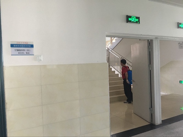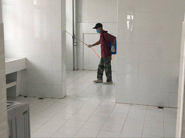 消毒工作中,总务处工作人员、校医务室医生、物业公司工作人员协同作战,将校园教学区、生活区及三个学部所有126个教室、130个功能教室、1160间寝室,使用84消毒液稀释喷雾,进行彻底消毒。