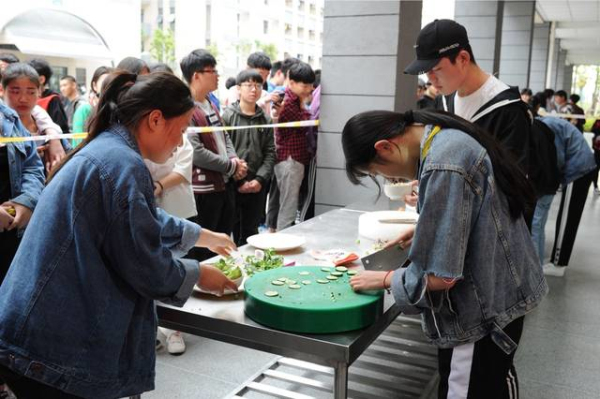 活动以“弘扬校园美食文化,打造安全健康餐饮”为主题,为广大学生营造健康向上的校园餐饮文化氛围。活动现场,人山人海,热闹非常。大厨们纷纷亮出拿手绝活,利索的动作、精湛的厨艺、精美的刀工,赢得了现场观众阵阵掌声。参加厨艺比赛的学生,自切,自配,自炒,纷纷亮出“看家绝技”,认真的烹饪食物、精心的摆盘,一道道色香味俱全的菜品获得了评委和观众肯定。服饰与文化艺术学部夏萍老师锦上添花,还亲手制作了精美的西式糕点,提供给评委和学生品尝。