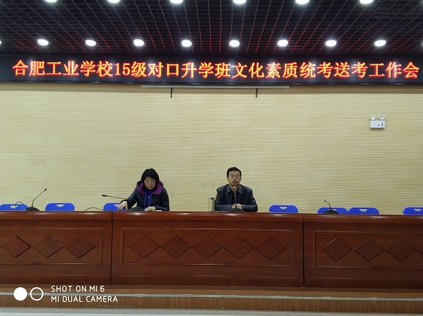3月22日,学校召开15级对口升学班文化课统考送考工作会,教务处处长蒋月珍主持会议,副校长曹文华做考前动员。曹文华强调送考纪律和安全保障,部署交通安全、人员调配、发车时间、早餐供应以及处理突发事件等具体分工,要求工作“零失误”,并现场指导学生消除紧张情绪,合理分配时间,树立信心,沉着应考。