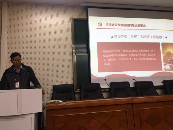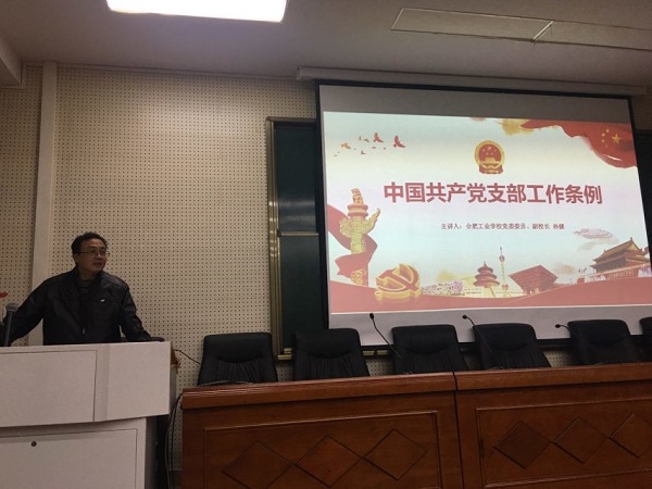 为了进一步加强学习型党组织建设,切实发挥党员教师的模范带头作用,积极响应中共中央关于学习修订后的《中国共产党纪律处分条例》的通知, 12月5日,中共合肥工业学校第一党支部召开了全体党员大会,校党委副书记、副校长赵华贵围绕“不忘初心、牢记使命,认真遵照执行新条例”的主题,给全体党员讲党课,图文并茂的深入分析纪律处分条例制定的意义及要求,剖析条例修订后的八大亮点,同时也向与会党员提出了更高的要求。