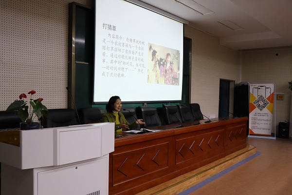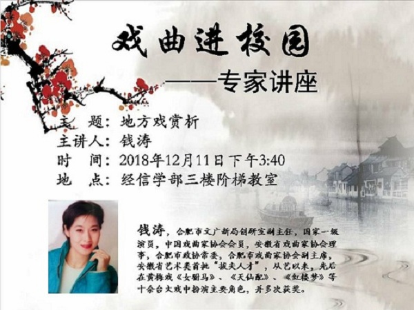 本次讲座主题为“地方戏赏析”,邀请了国家一级演员、安徽省艺术类首批“拔尖人才”、合肥市戏曲家协会副主席、合肥市文广新局创研室副主任钱涛。身为我省著名黄梅戏演员,钱涛不仅常年活跃在舞台上,还致力于“戏曲进校园”的普及和推广工作,是一位深受观众喜爱、学生尊敬的文化使者。讲座以黄梅戏为主,从剧种起源到发展历程,从伴奏乐器到乡音土语,从“三打七唱”到“四功五法”,从艺术特点到名家名段,她绘声绘色的描述,尤其是说唱结合的形式,让在座师生既感新鲜,又觉新奇。最后,钱涛还现场清唱了黄梅戏选段《谁料皇榜中状元》,细腻的表演,委婉的唱腔,使会场的气氛达到高潮,赢得满堂喝彩。