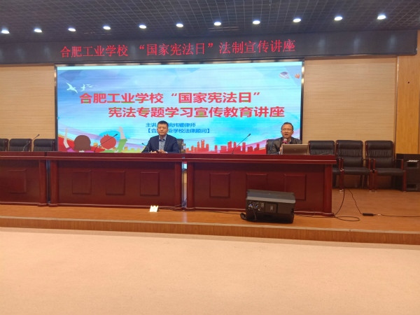 “12.4”国家宪法日来临之际,根据市教育局统一安排,合肥工业学校法律顾问姚炜耀律师于11月28日下午,到我校作“国家宪法日”法制宣传讲座。讲座由学校安全保卫处副处长黎扬主持,校学生会、各学部学生代表近400人参加此次讲座。