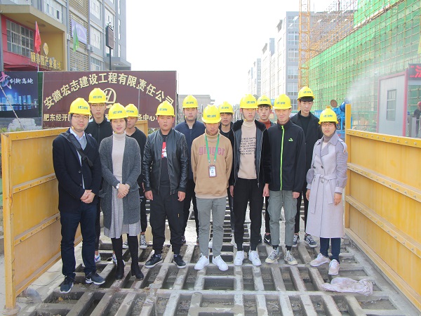 与会人员带领合肥工业学校建工学部部分学生参观宏志集团肥东经开区在建项目工地,看望在工地实习的学生。