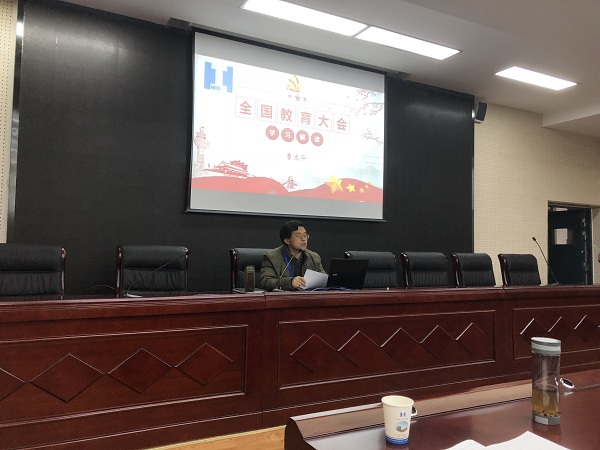 曹文华以“全国教育大会简介”、“习近平总书记发表重要讲话”、“李克强总理发表重要讲话”、“孙春兰副总理讲话精神”四个篇幅展开宣讲,详尽解读了全国教育大会精神,阐明了全国教育大会的重大现实意义和深远历史影响。他鼓励参会人员认真学习、深刻领会,将全国教育大会精神贯彻到工作中、落实到行动中,做好新时代的人民教师。