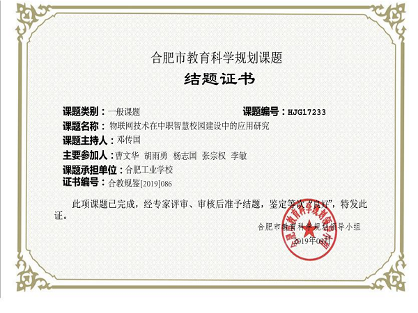 《物联网技术在中职智慧校园中的应用研究》课题是2017年合肥市教育科学规划课题,2017年6月立项,课题组成员主要由我校专业教师组成,曹文华副校长指导,邓传国老师主持。立项之后,市教育局和学校教研室高度重视,全程关注,多次选派专家进行网络分析和现场指导。两年来,在课题组成员的共同努力下,该课题研究取得了预期成果,三篇研究论文发表,编写出版校本教材一本,研究成果对职业学校的物联网建设、专业开设具有较好的借鉴作用。