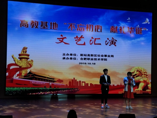胜利的十月,激情飞扬,青春的十月,歌声嘹亮。70载峥嵘岁月,70年辉煌荣光。在举国上下欢庆中华人民共和国成立70周年之际,为表达合肥新站区高教基地各院校师生对祖国母亲的深深祝福,展示各个院校的校园文化建设成果,促进院校间的文化交流。由合肥新站高新区社会事业局主办的高教基地各院校文艺汇演,于2019年10月18日下午在合肥职业技术学院大学生活动中心隆重举行。