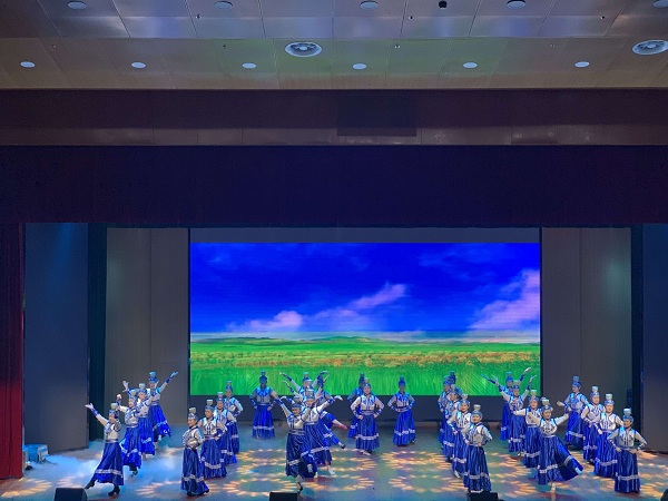 我校服饰学部刘曼妮老师指导编排的舞蹈《蓝色的游吟》,代表学校参加了这次文艺汇演。参演师生以艺术谱写初心,用音乐叩响使命。节目《蓝色的游吟》以蒙古舞的炫丽服装、悠扬的草原旋律,精湛豪放的舞姿,磅礴大气的台风,博得观众阵阵掌声,演出取得了圆满成功。展示了我校师生齐心同筑中国梦,共祝祖国70华诞,对祖国无限热爱的精神风貌。
