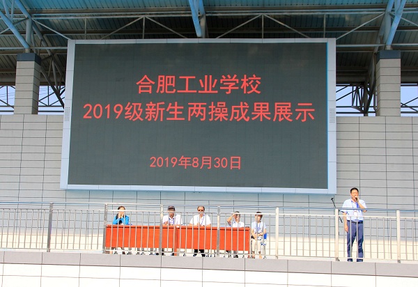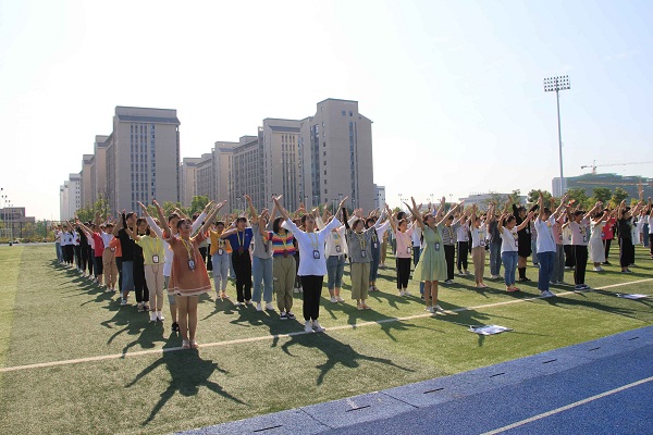 8月30日上午8:30,2019级新生“广播操、礼仪操”培训成果展示在田径场隆重举行。随着教务处处长蒋月珍一声令下,打头阵的建工学部的同学们喊着响亮的口号,踏着稳健的步伐入场列队,在动感音乐的伴奏声中展示两天来的训练成果。接着入场的经信和服饰学部的同学们也不甘示弱,队列整齐,精神抖擞,动作舒展,充分展现了团结协作、乐观向上、追求卓越的精神风貌。