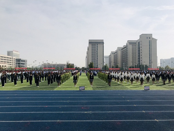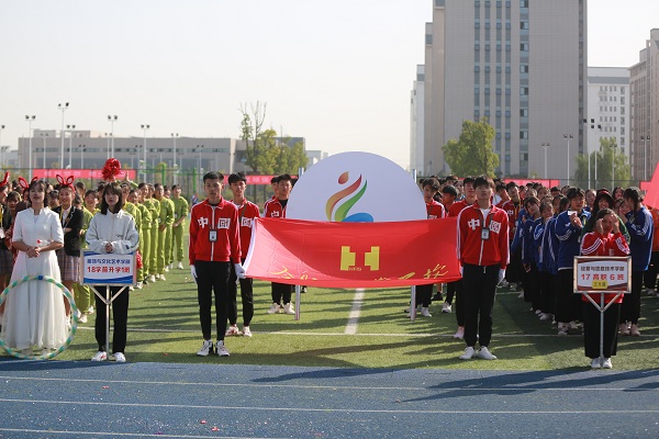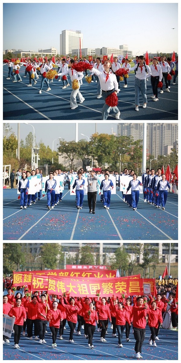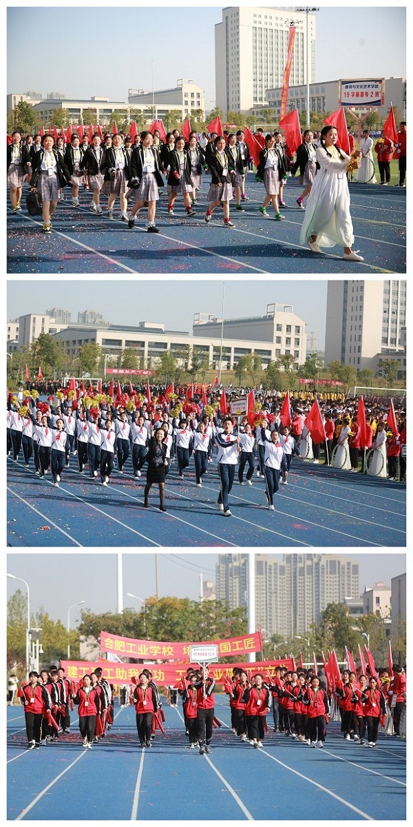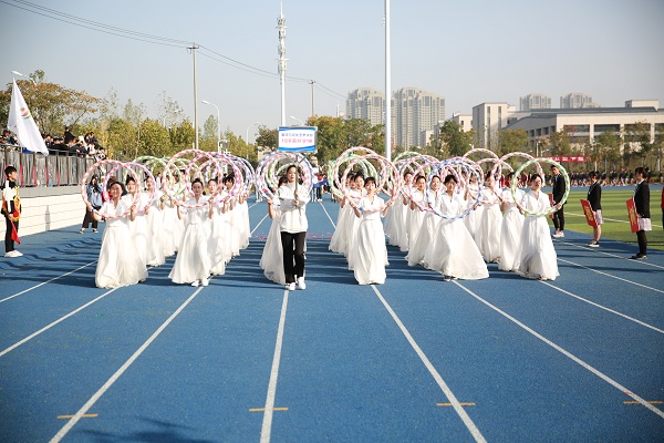 伴随着激情昂扬的《运动员进行曲》,护旗队护卫着国旗、校旗、会标英姿勃发;花环队一袭白色连衣裙,仪态万千;各学部教职工方阵和遴选出的学生运动员代表方阵,迈着整齐的步伐,喊着嘹亮的口号依次入场。