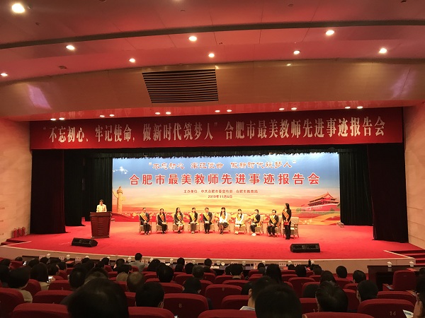 不忘初心、牢记使命,做新时代筑梦人。2019年11月6日下午,合肥市最美教师先进事迹报告会在市政务中心小会堂举行,近500名教育工作者齐聚一堂。我校工会主席王承江带领近40名教师代表参加会议,认真聆听报告。