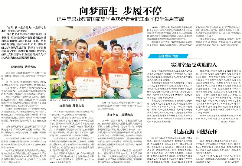 2020年1月1日《合肥日报》刊载题目为《向梦而生 步履不停》的文章,报道了我校尉言辉同学的事迹。