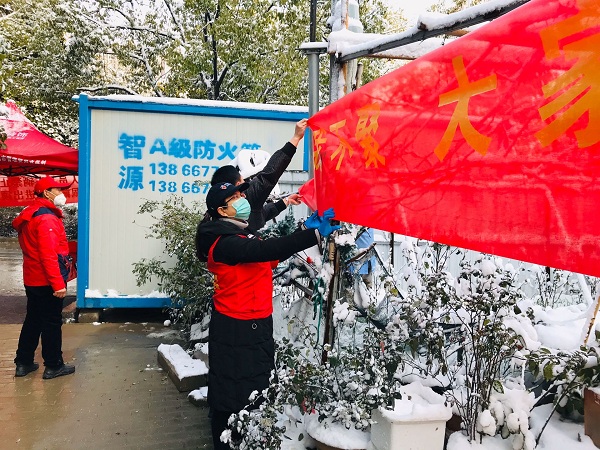 丁志方: “面对突如其来的大雪,只是一个劲跺脚来缓解寒冷。志愿点没办法通电,最后还是从住户引出一根电线通电,灯亮的瞬间大家都很兴奋。社区负责人得知情况,临下班前送来取暖器。”“今天气温偏低,金荷社区孙站长一上午两次来驻点问候,除了送来志愿者马夹,还与我们一起将新的宣传标语条幅挂起来。”