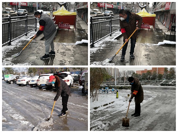 战“疫”现场的艰难无需描述,感人画面也不一而足。田闽侠、蔡雪勇、聊宗龙、蔺大胜等同志一大早就拿起铲锹弯腰铲雪,为市民安全出行开辟通道。张其旺同志本需要照顾九十岁老母亲,但他克服困难第一时间报名参战,坚守在抗疫一线。卫星、章曙滨、李国辉、陈永召、唐德旻、田东生等同志严格执行工作纪律,对进出人员检查、登记、测量体温,同时配合社区开展抗疫宣传教育活动,对特殊困难家庭进行帮扶。共青团员蒯家柢并不因为自己校聘教师身份而置身事外,主动报名参战,探访隔离户。张超、蔺大胜同志值班到深夜,坚持一个个给车库进来人员测量体温、询问登记。于敬东同志得到了居民楼住户的配合,说“下午六七点天黑后,主动张罗为我们接上了照明灯光;社区委的胡书记送来了暖身姜汤;学校党委、领导对我们下沉社区人员的知寒问暖”……