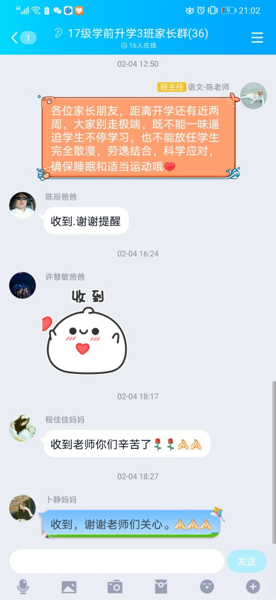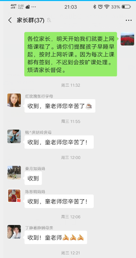 家校携手共育。网络课堂之所以成功开启,离不开与学生、学生家长大力支持。班主任每天早早提醒学生按时登录,准好上课的内容,遇到一些“马大哈”学生未能及时上线,班主任会第一时间与学生及家长联系,督促学生尽快上线学习。课后的作业除了老师在线批改以外,要求家长协助检查。家校携手共育,促进学生健康成长。
