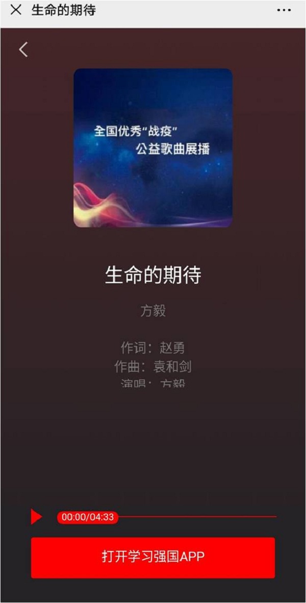 目前,歌曲《生命的期待》已在多家网络音乐平台、微信公众号陆续上线,并荣登中宣部“学习强国”学习平台全国优秀“战疫”公益歌曲展播,得到无数网友的喜爱和点赞。