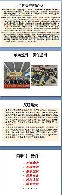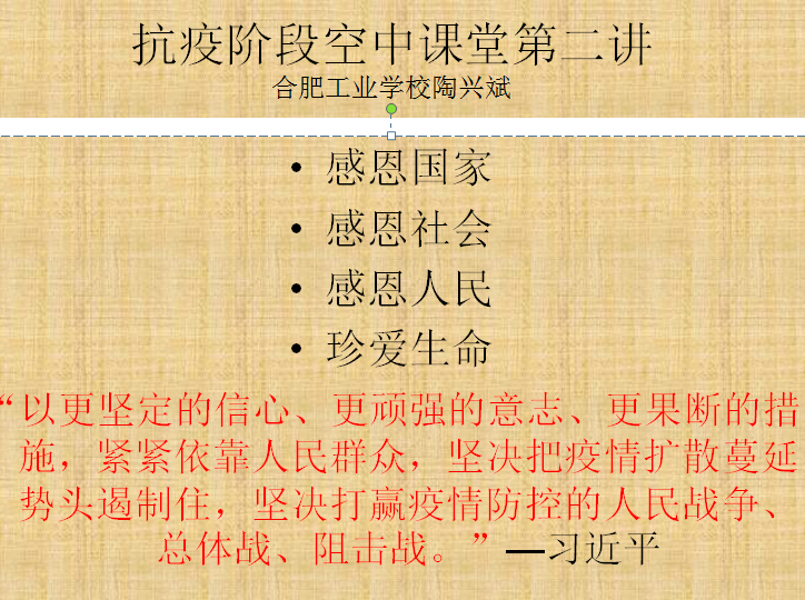 思政老师陶兴斌的空中课堂第二讲:珍爱生命。以学会感恩,珍爱生命为主题,利用抗疫一线大量鲜活的案例,教育学生,一个人的力量是微不足道的,在疫情面前,众多“最美逆行者”,以个人力量积聚起战胜疫情的磅礴力量,万众一心、共克时艰,疫情防控阻击战定会取得胜利。通过空中课堂,使学生受到一次深刻的思想教育。