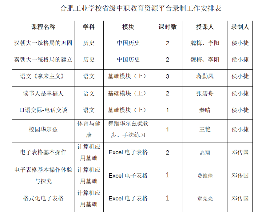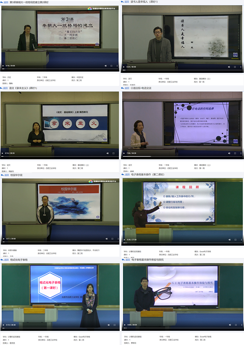 根据《安徽省中等职业学校线上教学工作指南(三)》要求,省职成处、省教科院、省电教馆于2月22日制定并下发《安徽省中等职业学校新冠肺炎疫情防控期间教学视频资源录制和应用工作方案》。该方案由安徽省教育厅指导并统筹,各地市教育主管部门牵头具体组织完成授课、教学视频资源录制和现有优质资源推送应用,并通过网络平台点播。